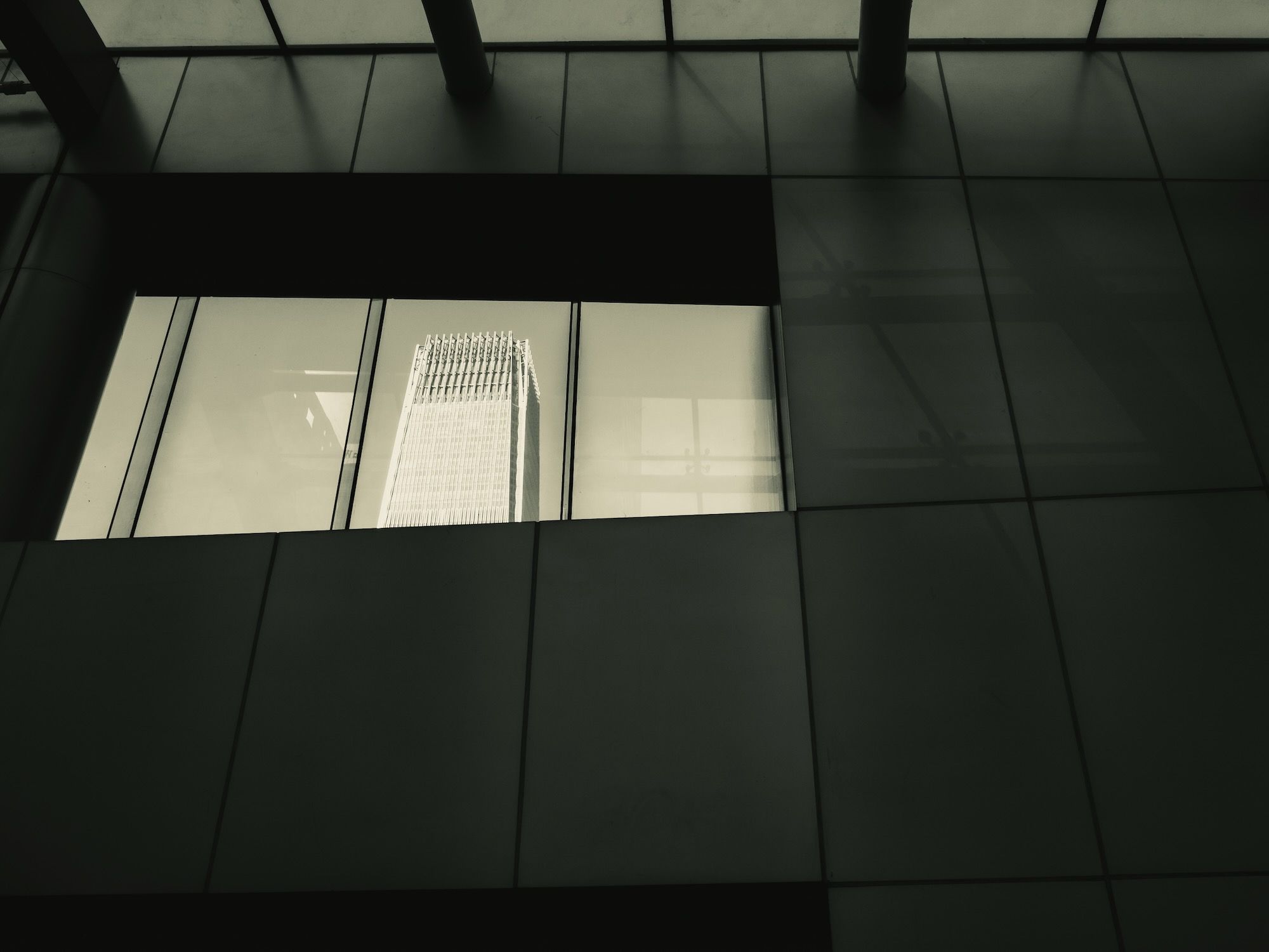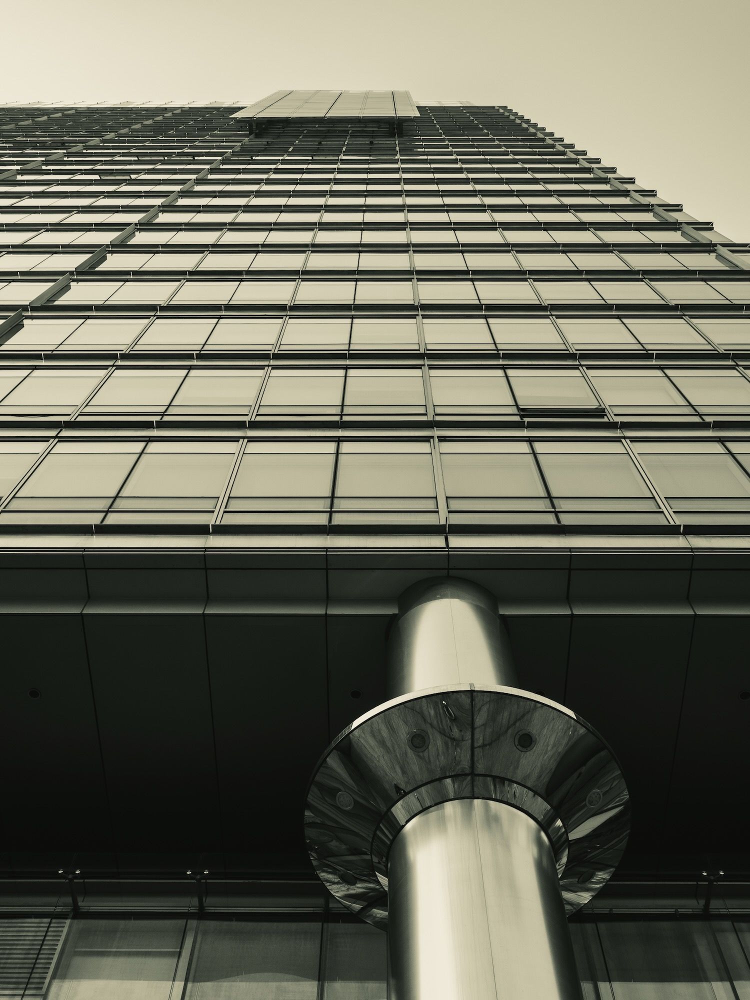 Ahh, building lookup photos. One of my most common pictures to take. In these we have one mostly symmetrical and one non-symmetrical. I like how in the second one, the supporting beam in the bottom is off-center, but is balanced by the structure near the top of the building which is also off-center but on the opposite side.